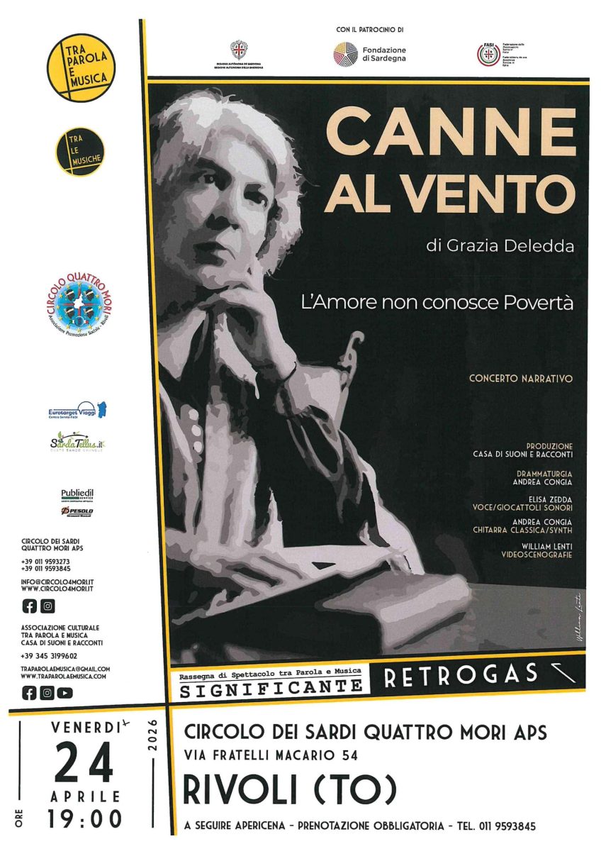 In occasione del Centenario del Premio Nobel per la letteratura Grazia Deledda, il Circolo dei Sardi Quattro Mori – APS – organizza il Concerto Narrativo “CANNE AL VENTO” con a seguire Apericena – prenotazione obbligatoria telefonando allo 0119593273.